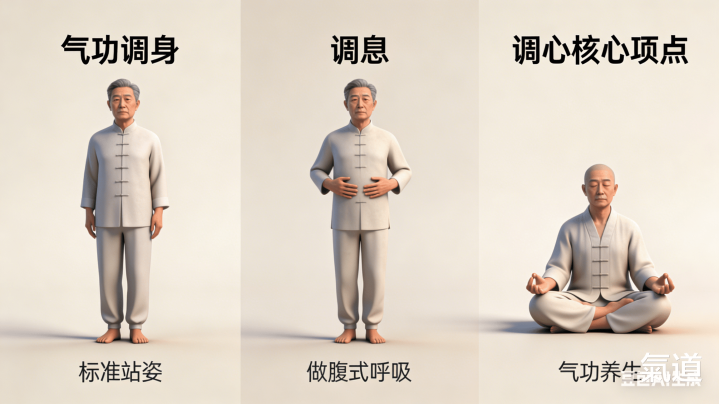 气功初学其实很简短,毋庸刻意练复杂招式,惟有收拢“调身、调息、调心”三个关键,就能练对、练出成果。