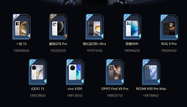 鲁群众这个年度性能最强手机一共评比出十款,名循序二的是一加15,名循序三的是realmeGT8 Pro,名循序四的是努比亚Z80 Ultra,名循序五的是荣耀WIN,名循序六的是ROG 9 Pro、名循序七的是iQOO 15、名循序八的是vivo X300、名循序九的是OPPO Find X9 Pro,名循序十的是REDMI K90 Pro Max。不错看出这个榜单上榜的机型基本上齐所以性能游戏体验为卖点的,平方全面平衡的机型只好两款上榜。出奇义的是小米17系列一网尽扫、荣耀Magic8系列也一网尽扫。倒是荣耀WIN这款机型给出了惊喜。