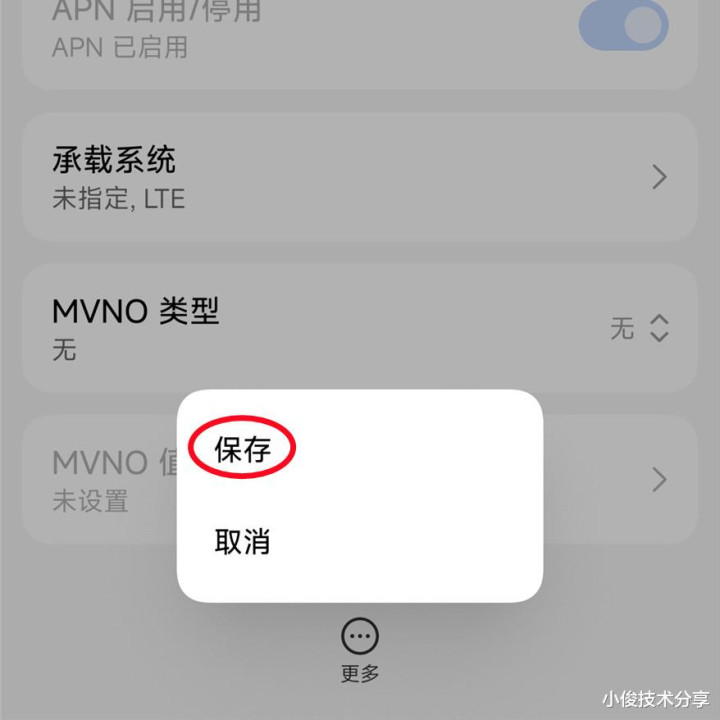 全部建造好,之后,我们点一下底下的【更多】,然后点一下【保存】,这样一个新的接入点就创建顺利了,创建顺利之后,我们复返去,哎,此时就不错看到我们刚刚创建的APN了!