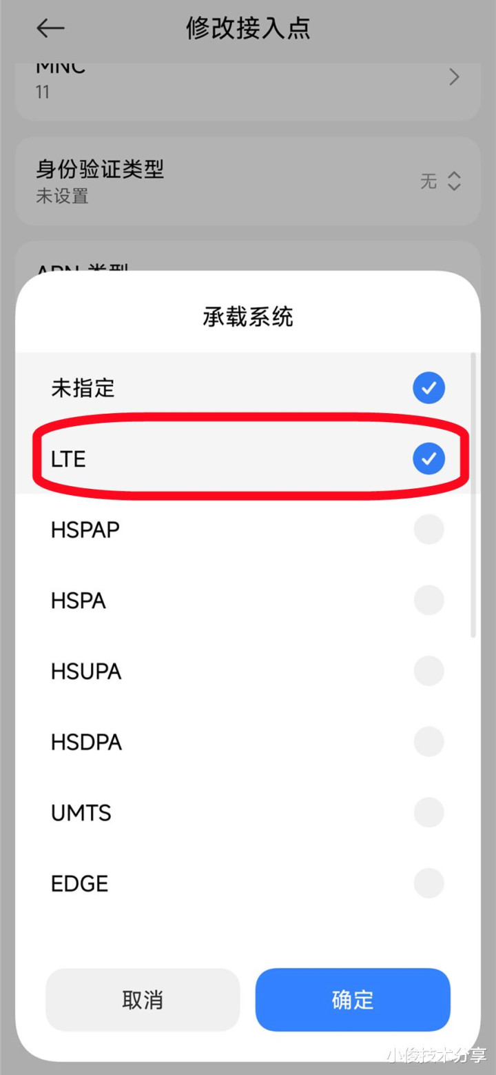 好,输入完成之后,接着我们往下滑,鄙人面这里有一个承载系统,我们点进去,然后把它采取为【LTE】,看到了吗?给它勾选上。天然第一个未指定不要去改啊不要动。