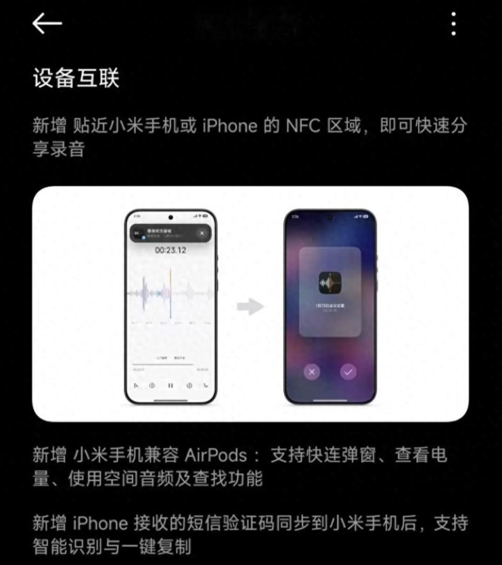 说到双抓,此次的互联互通几乎是在挖苹果的墙角,比如小米手机逼近iPhone,灌音文献能奏凯飞夙昔;更绝的是iPhone收到的考据码,小米这边能同步识别并一键复制。