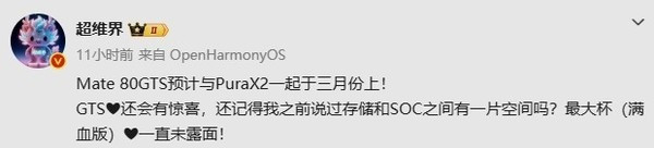 其实,近日,数码博主“超维界”曾经爆料称,“Mate 80GTS预测与PuraX2一谈于三月份上! GTS❤还会有惊喜,还牢记我之前说过存储和SOC之间有一派空间吗?最大杯(满血版)❤一直未出头!”这基本也印证了这次“定焦数码”爆料的信息。毕竟,之前“定焦数码”曾经发文称,华为Mate 80 GTS和第二代Pura X阔折叠屏手机,贪图暂定于2026年上半年登场。
