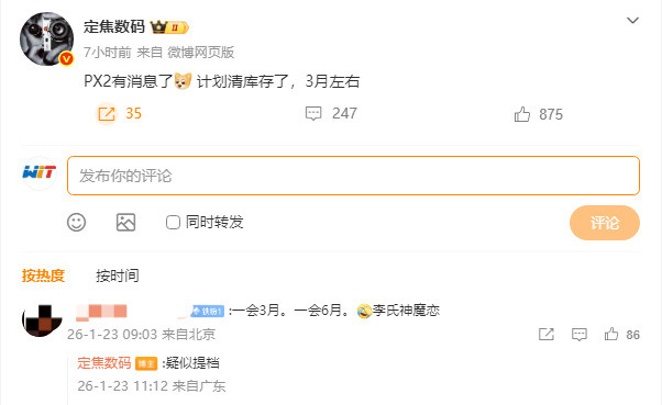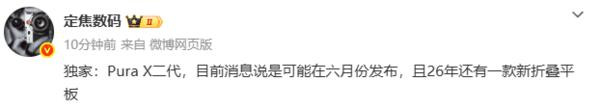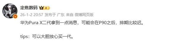 继此前,数码博主“定焦数码”曾爆料华为新一代阔折叠屏手机Pura X2将与Mate 80 GTS高性能新机一谈在本年6月发布的音讯后,日前,该博主再次曝出了大回转的最新音讯,据其称,该机将于3月发布,况兼,为了给新机闪开商场,华为官方依然制定了为第一代Pura X清算库存的贪图。对此有网友提议质疑,“一会3月。一会6月。”对此,该博主回复称,“疑似提档”。