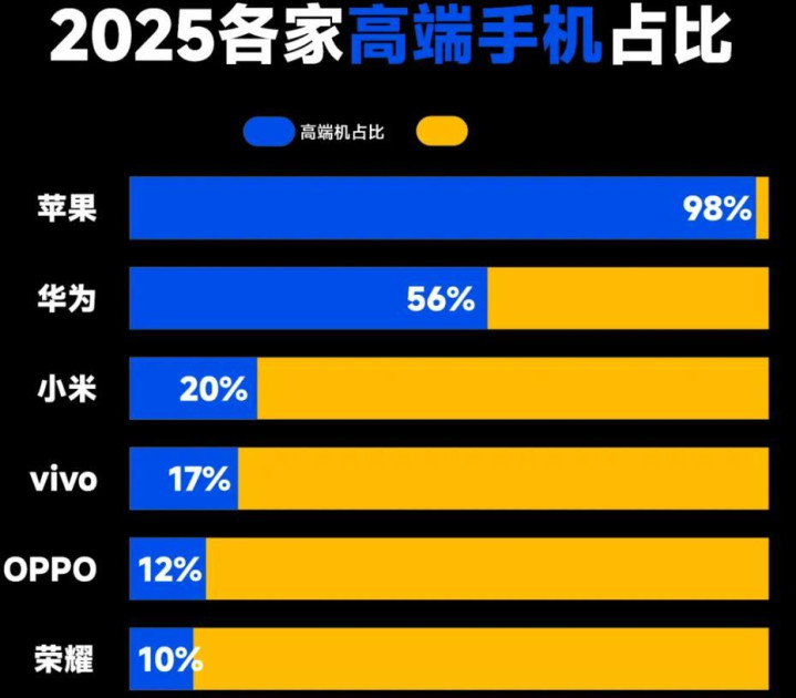 最近,有媒体公布了一组2025年的数据,专门统计了各家手机销量里,售价跨越4000元的高端机型所占的比例。这张图,可以说把各家的“高端成色”照得一清二楚。