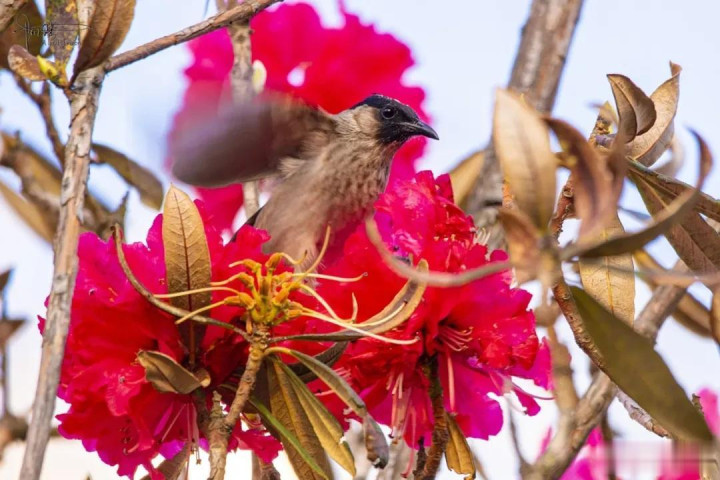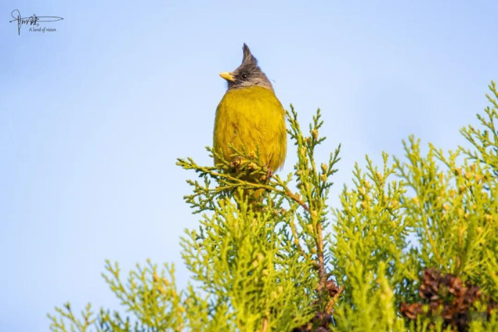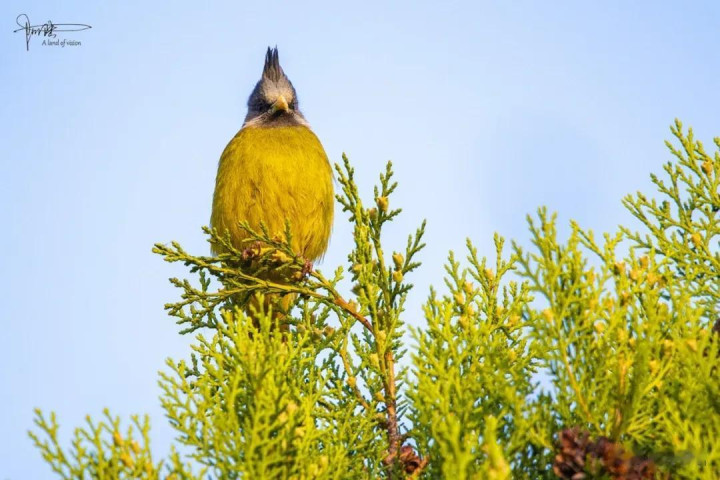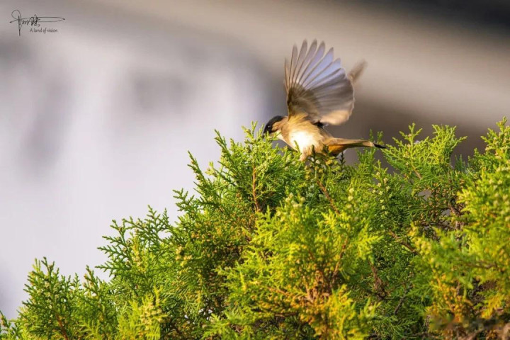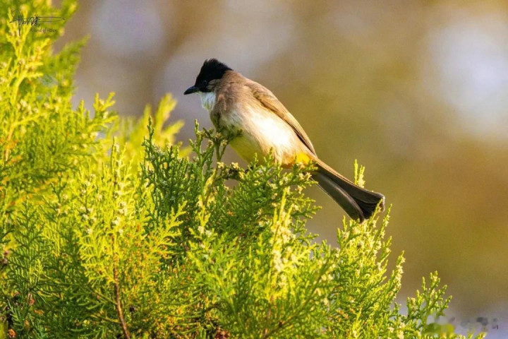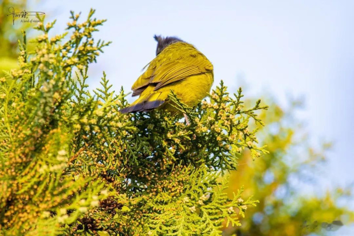 其实我没仔细分别,归正其时看见这种鹎的屁股上有一戳毛是黄色的,故而就认作是黄臀鹎(又称黄屁屁),它是雀形目鹎科鹎属鸟类,成鸟额、头顶至枕部玄色,无显着冠羽,眼先和眼周亦为玄色,耳羽灰褐色,上体土褐色,尾暗褐色具不显着横斑,翼暗褐色……