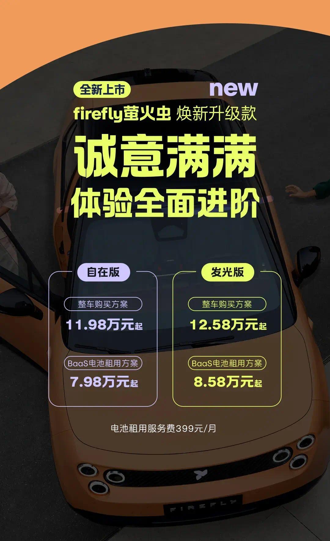 2026款firefly萤火虫来了,价钱11.98-12.58万,用租电的样式的话,价钱下探到7.98万起。新车在策画、能源、建立等方面齐进行了升级,还增多了智驾小蓝灯。