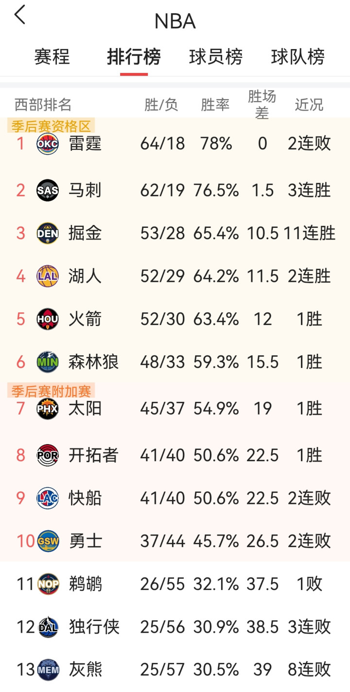 西部最终名次与季后赛对阵明晰出炉:雷霆64胜18负第一,马刺62胜19负第二,掘金53胜28负第三,湖东说念主52胜29负第四,火箭52胜30负第五,丛林狼48胜33负第六,太阳45胜37负第七,设备者41胜40负第八,快船41胜40负第九,英雄37胜44负第十。