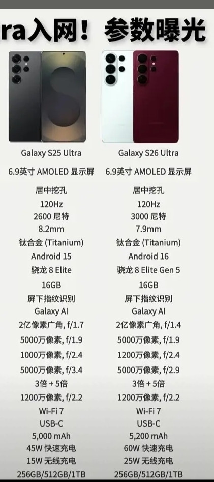 1:2026年1月,三星Galaxy S26 Ultra通过国内干系机构入彀审核,中枢竖立参数随之曝光。当作三星年度旗舰的扛鼎之作,这款机型在屏幕、性能、影像等维度均进行了针对性升级,与前代S25 Ultra的相反也缓缓明晰。以下集会官方入彀参数,为你全面瓦解两代机型的变化与传承。