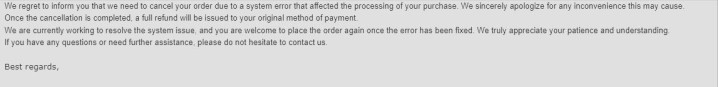 “咱们相配对不起地见告您,因系统故障影响了您的订单处理经过,咱们不得不取消您的订单。关于此事给您带来的任何未便,咱们致以最竭诚的歉意。
