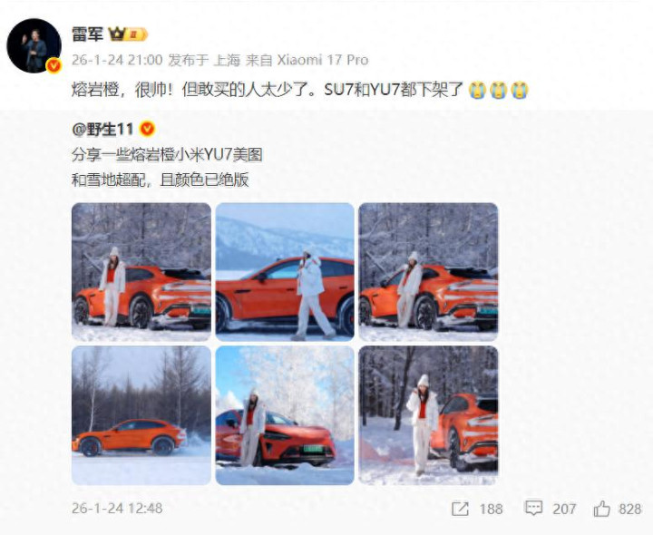 事情的启事是有大V发了一组小米YU7熔岩橙配色的好意思图,且默示这个配色与雪地超配,且颜料已绝版。这个事让雷军知说念了,雷军成功默示:熔岩橙很帅,但买得东说念主太少了。小米SU7与小米YU7这个骨子齐下架了,要道是雷军连发三个“泪目”款式。在与网友的互动中雷军还默示:一款车漆雅瞻念,而况公共齐敢买,实在是太难了。查询了一下有关信息,那时小米SU7这个配色出来的时辰,雷军就默示:“有品位、饱胀自信的东说念主材干着实垄断,开这样的车到北京三里屯,能不可炸街?”。要道是这款车漆小米官方那时也进行了科普,它相干于其它颜料工艺难度极高,呈现出来的色调亦然唯一无二的,怎样市集并不认同。是以从雷军的表述中咱们十足不错看到那种无奈。如实在当下产物好与不好是市集说了算,市集认同度才是第一位的。