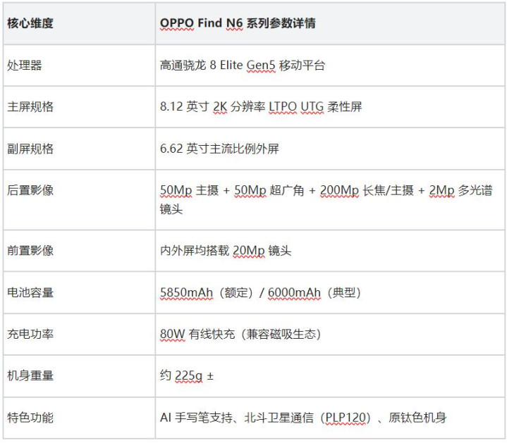 为了让全球更直不雅地了解OPPO Find N6的硬件跨度,我整理了当今已知的中枢参数表:
