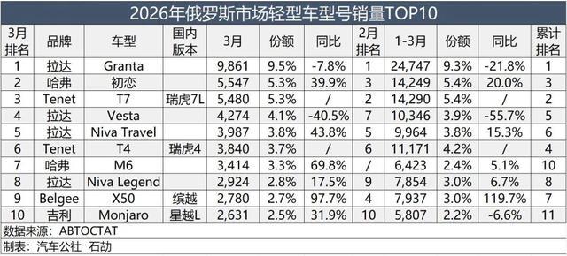 车型方面,拉达Granta(-7.8%)络续下滑,其商场份额从旧年3月的13.4%降至本月的仅9.5%。不外,这仍好于2月份的9.1%和1月份的9.4%。