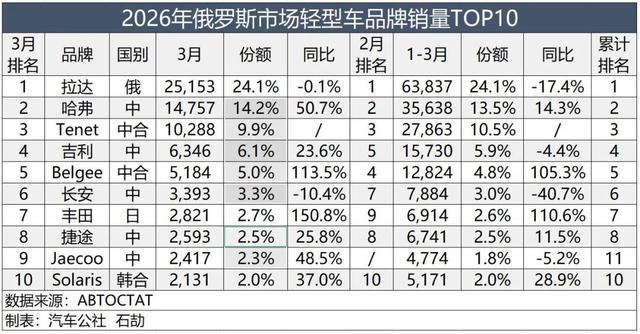 从3月份情况看,前十强里还有长安、捷途、Jaecoo等中国品牌,共计7家中国汽车品牌跨入前十名。剩下的唯有原土的拉达、日本的丰田和韩国当代起亚“转生”的合股品牌Solaris,后者由俄罗斯AGR汽车集团收购当代起亚圣彼得堡工场投产。