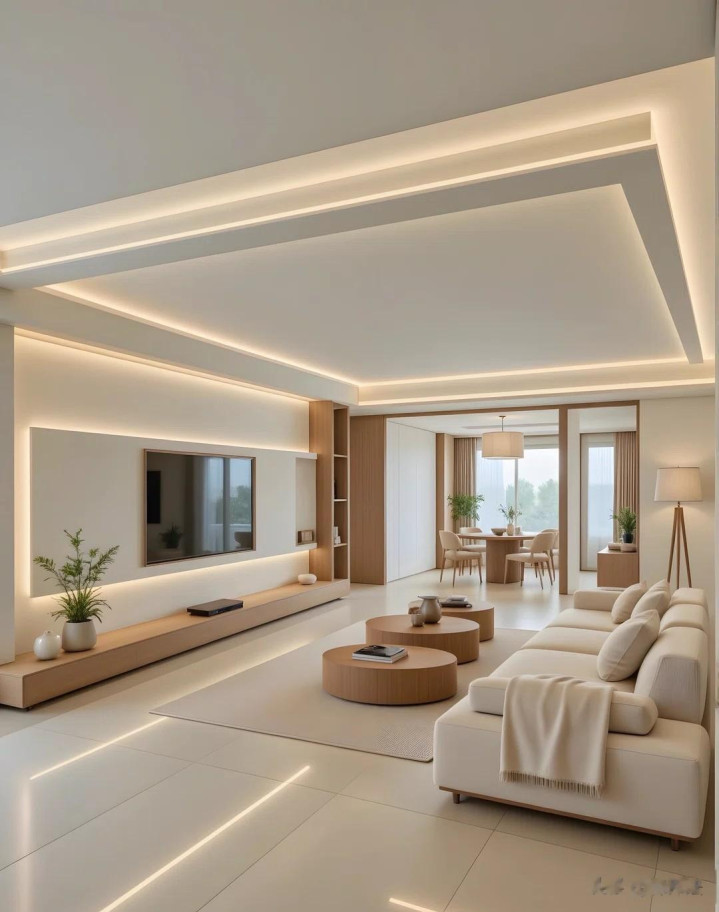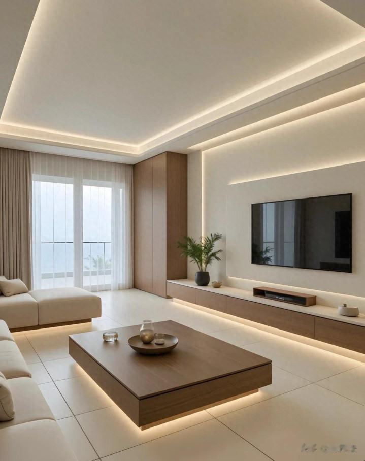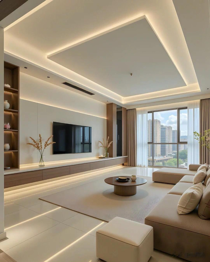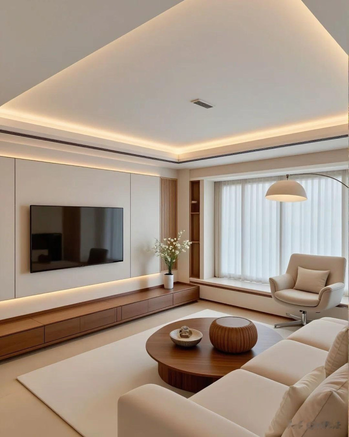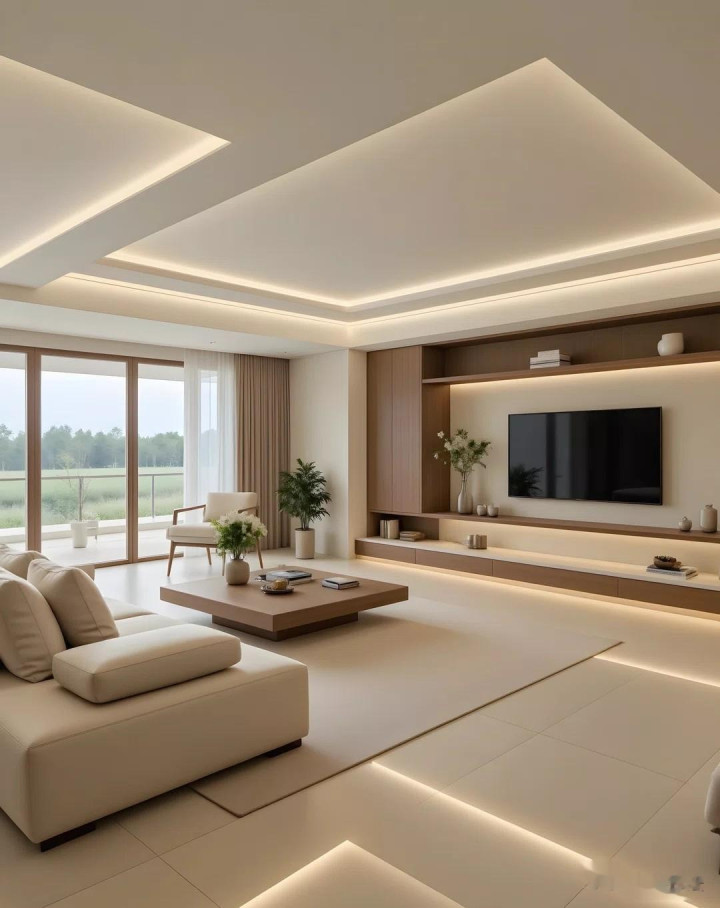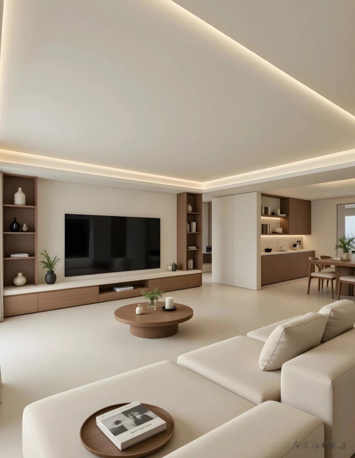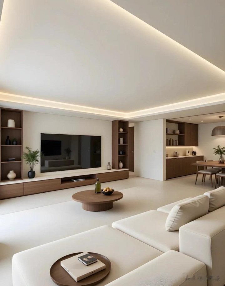 客厅无主灯诡计搭配线条闪避灯带,营造出流动的艺术氛围,一望开阔的双眼皮大平顶,显得圣洁明快,在视觉上拉伸了空间高度,使东谈主感到振奋而收缩。