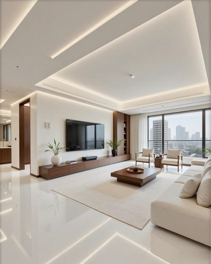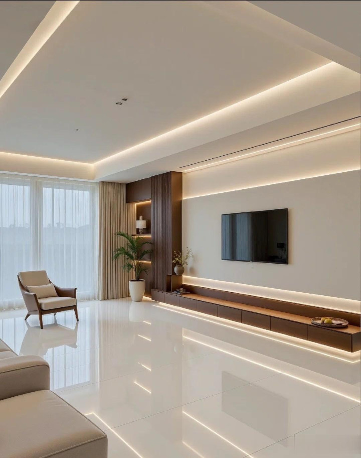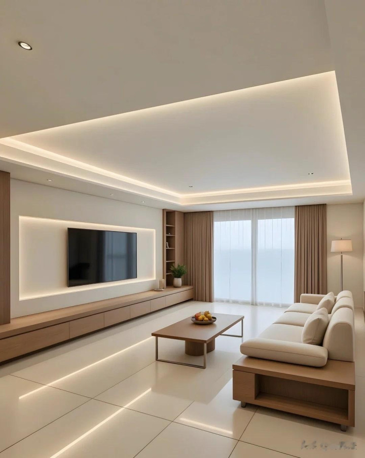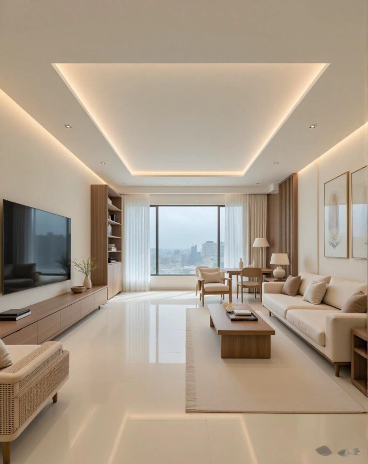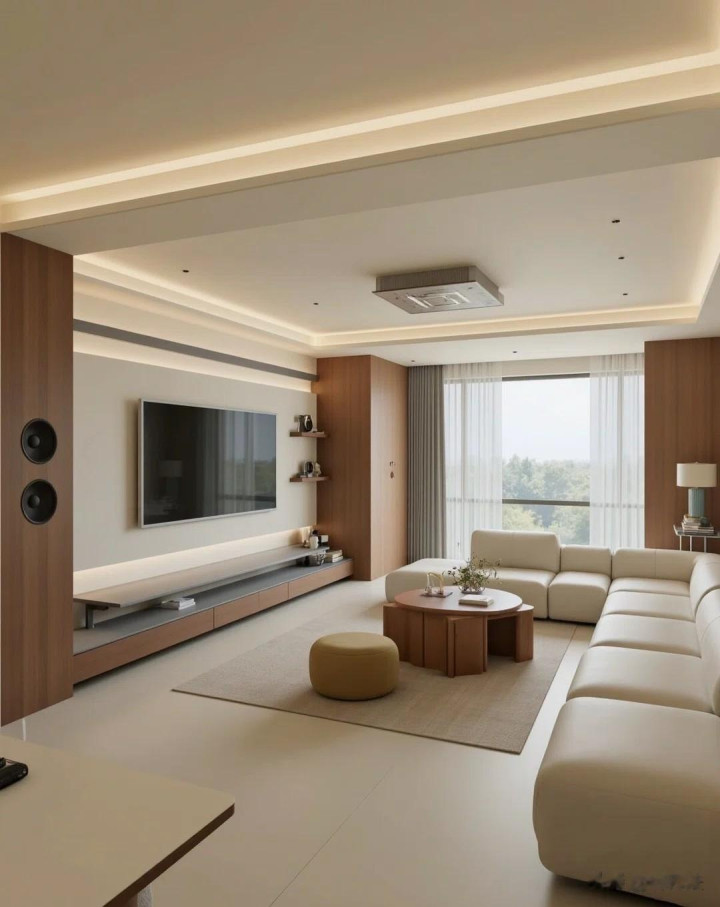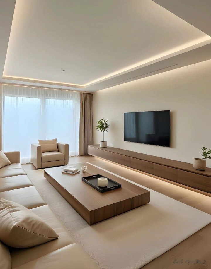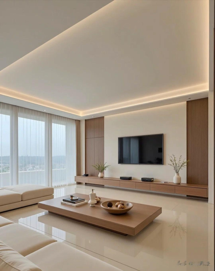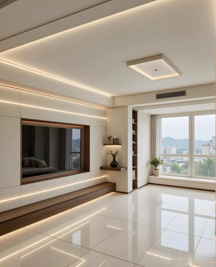 客厅无主灯诡计搭配线条闪避灯带,营造出流动的艺术氛围,一望开阔的双眼皮大平顶,显得圣洁明快,在视觉上拉伸了空间高度,使东谈主感到振奋而收缩。