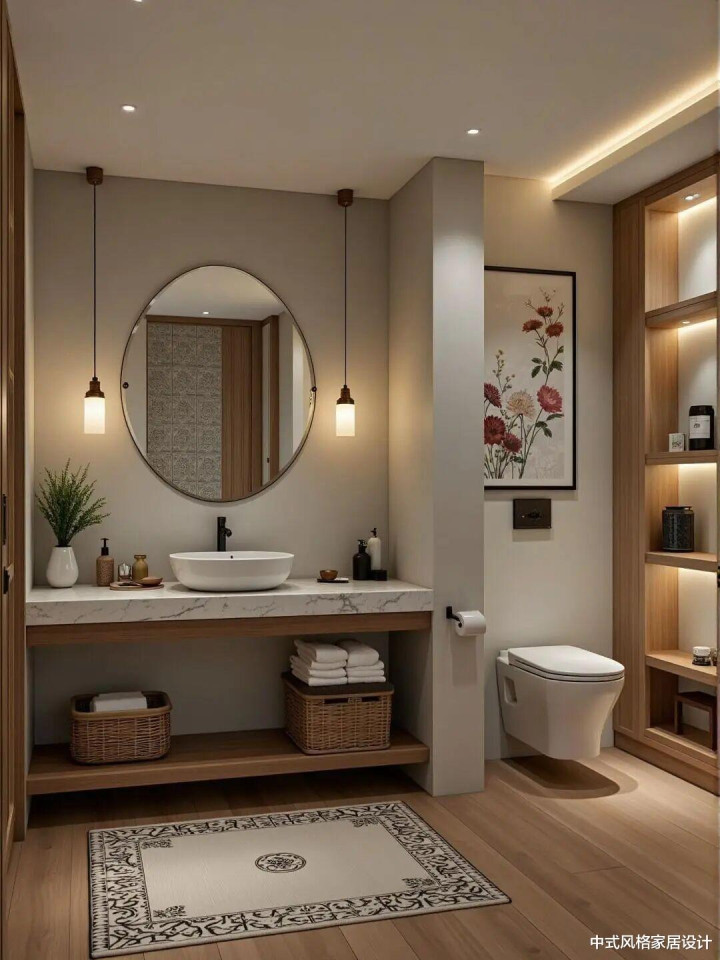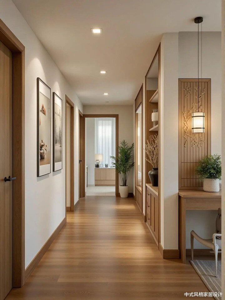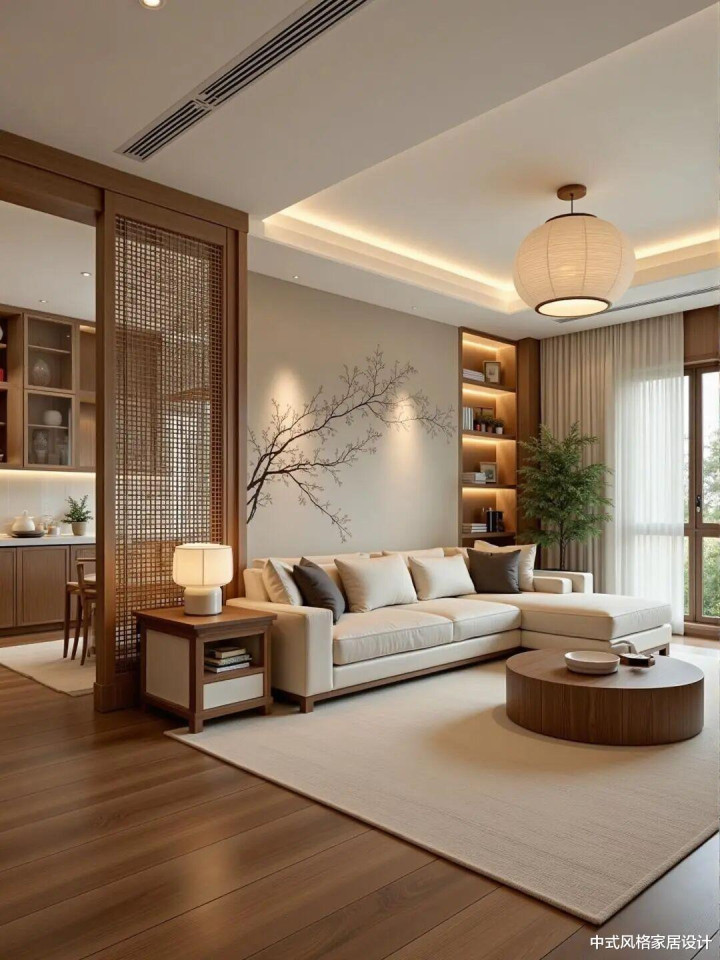 客厅以原木色为基调,会通东方禅意与现代从简。浅米色布艺沙发搭配圆形木质茶几,线条流通;两侧木质边柜与敞开式书架对称漫衍,内置暖光灯带。墙面吊挂水墨梅花图,搭配竹编屏风与垂落纱帘;旯旮绿植增添期许,暖黄色纸灯笼吊灯营造温柔光影。大地为深色实木地板,搭配浅米色地毯,举座颜色温润和谐,呈现宁静而宽裕诗意的东方好意思学。
