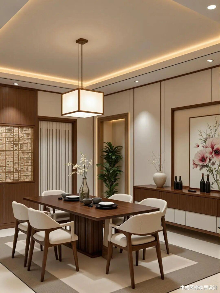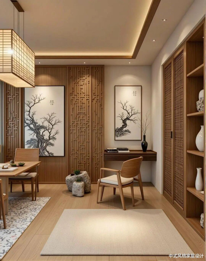 木质格栅屏风搭配水墨松枝挂画,吊挂方形竹编吊灯,下方设原木餐桌与藤编餐椅。镶嵌式博古架陈设淡雅瓷器,旁有从简书架与绿植。浅米色地毯搭配单东谈主椅,墙面吊挂枯枝图,旯旮立式花瓶点缀,营造静谧漂后的东方韵味。在这片底色之上,格栅与花窗的线条悄然勾画出空间的骨骼。它们或疏或密,切割着光泽与视野,将传统诞生中那份欲语还休的含蓄与治安,转念为现代居室中灵动的光影游戏与视觉节拍,让静态的空间有了呼吸的韵律。