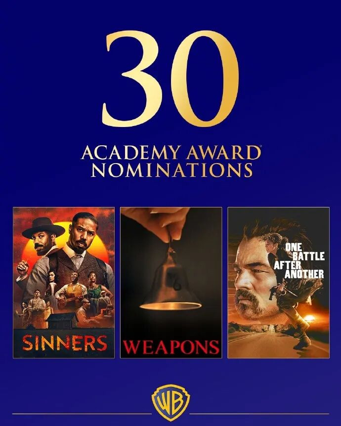 1月22日晚,华纳昆仲电影官方微博发布:“至心感谢学院认同咱们的演职东谈主员,本年咱们一共荣获30项奥斯卡®提名:影片《罪东谈主》取得16项提名创下新记录,其中包括最好影片;影片《一战再战》取得13项提名,其中也包括最好影片;影片《凶器》取得1项提名。
