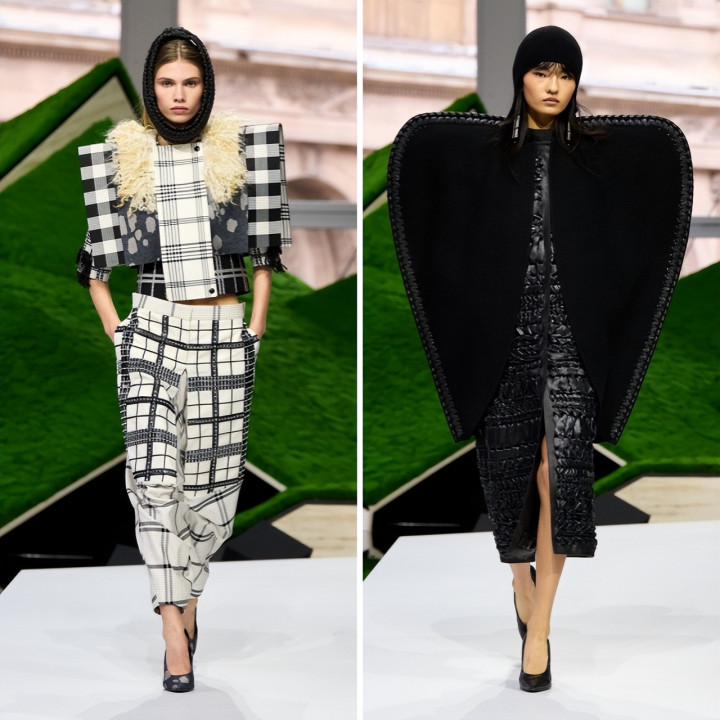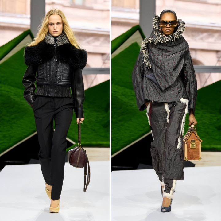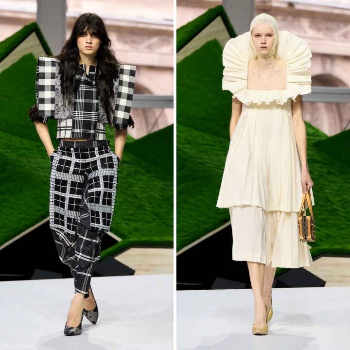 绗缝皮革大衣、拼接格纹图案、广泛的荷叶边领口与相配的无檐帽。仔细不雅察细节,你会发现点缀着富裕线索感的配饰:广泛的纽扣、工整的背包、追念本源并以全新廓形再行界说的“诺埃”(Noé)包袋、饰有荷叶边的手套、内置式紧身胸衣,以及弃取绗缝工艺的锥形帽。