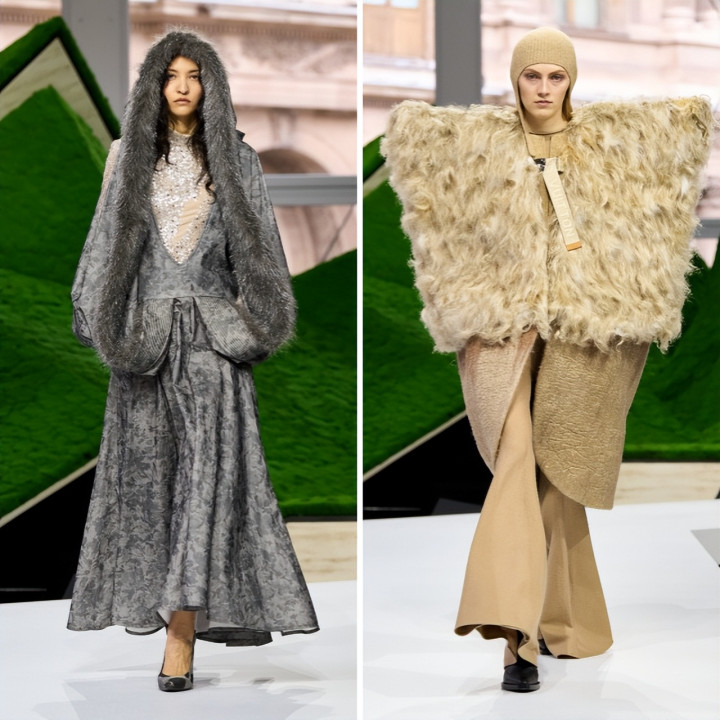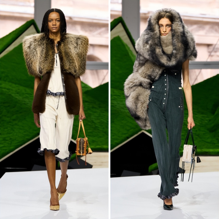 秀场设在卢浮宫的一个展厅内,假山连绵转动,模特们穿梭其间。这一狡计灵感源自品牌首创东谈主路易·威登的桑梓——位于法国与瑞士边境隔邻的汝拉山脉峡谷。