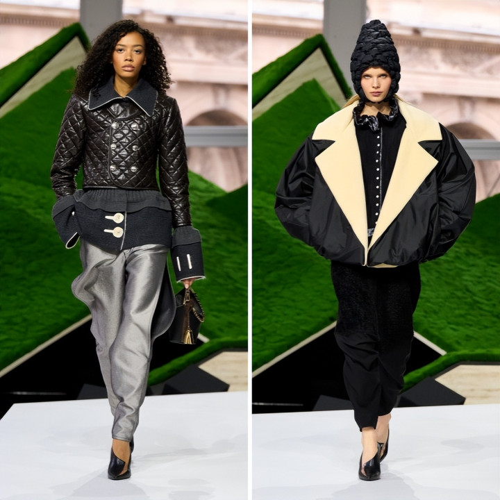 在时装周的终末一天,“路易威登”通过孩童般的深嗜心滤镜,呈现了时尚的蓦地。昔时感皆备的几何廓形外衣,搭配缅念念碑般的夸张耳饰,以及重重叠叠的穿搭。