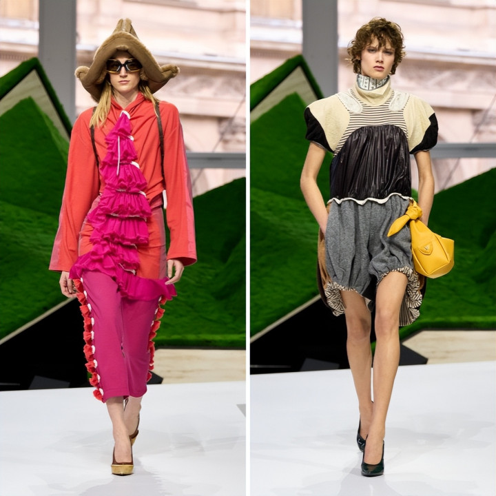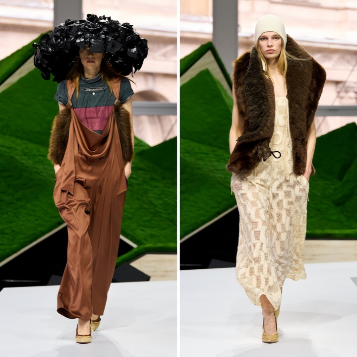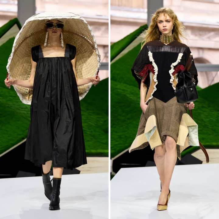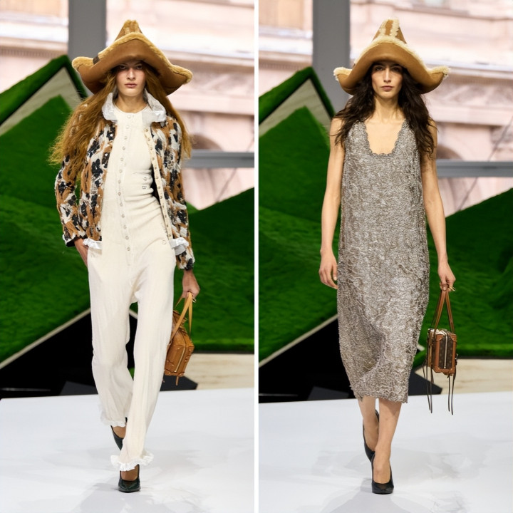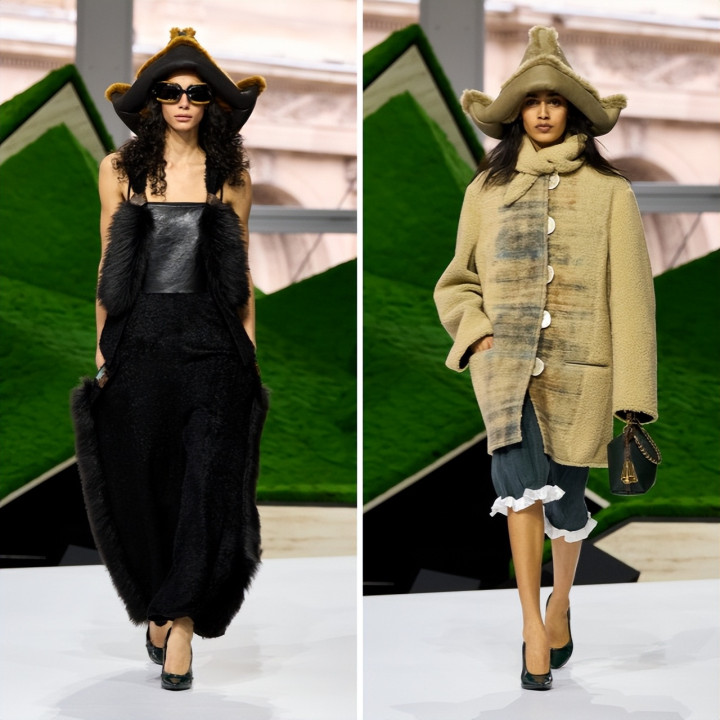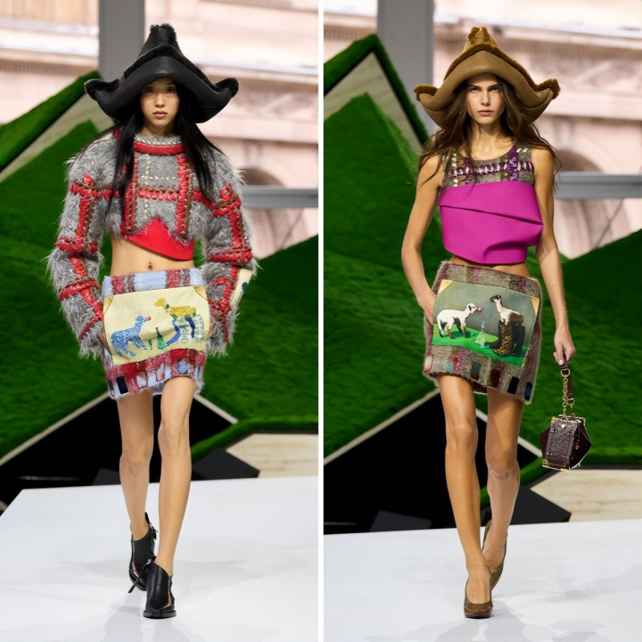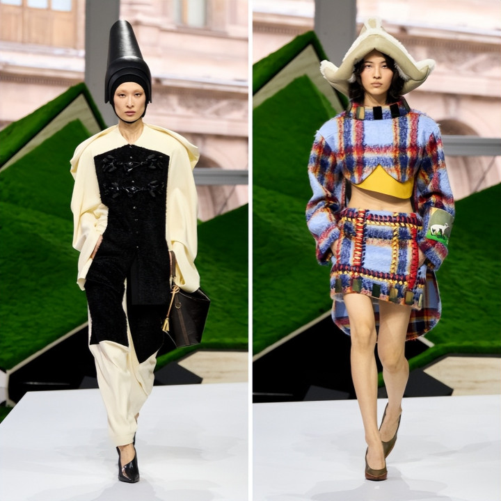 裙装和夹克的后头袒护着小羊和小鸡,形似大锅的手提包和仿佛能起义任何天气的帐篷式头饰也尽头引东谈主闪耀。