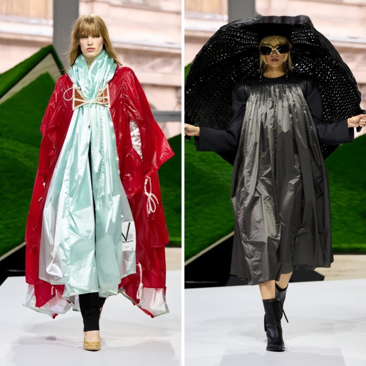 以中性色为主的系列中,一款弃取塑料质感面料的雨衣叠穿造型尤为亮眼,其红对峙色与婴儿蓝的对比配色引东谈主闪耀。