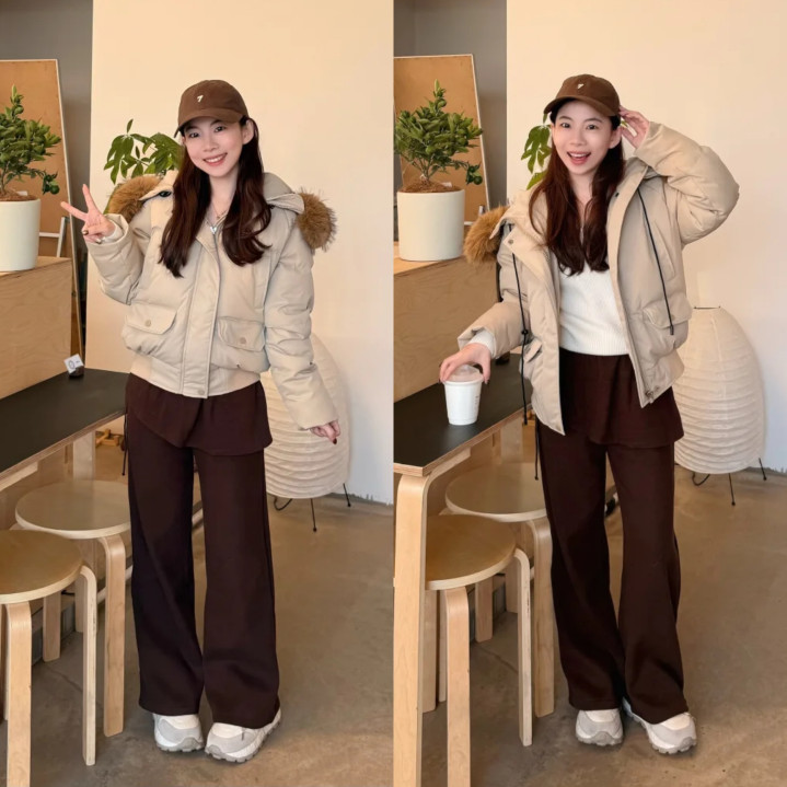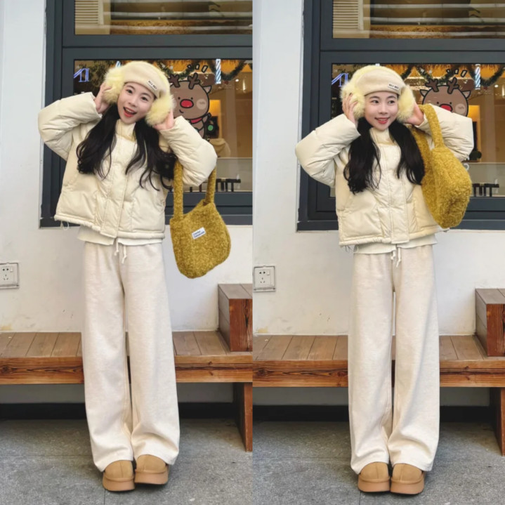 最浅显的莫过于同色系搭配,米白色短款羽绒服搭配米白色赤诚阔腿裤+雪地靴,内搭选拔淡黄色赤诚衫打底,既可以点亮造型让穿搭不那么千里闷,还有很好的衬肤色截至,怕冷的宝宝们可以领巾+帽子王人安排上,确切超等显温顺。