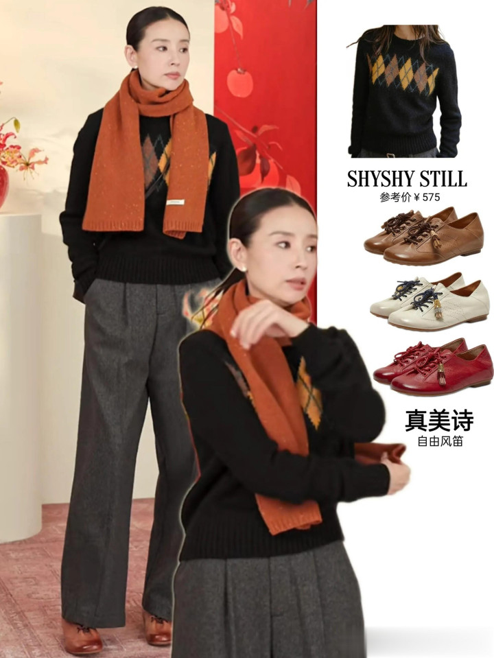 菱格毛衣低调雅致,焦糖色领巾一搭就成了点睛之笔,再配上解放风笛德训鞋,相沿英伦味儿径直拉满,过年见父老穿这套肃肃又显气质,还能讨个好彩头~