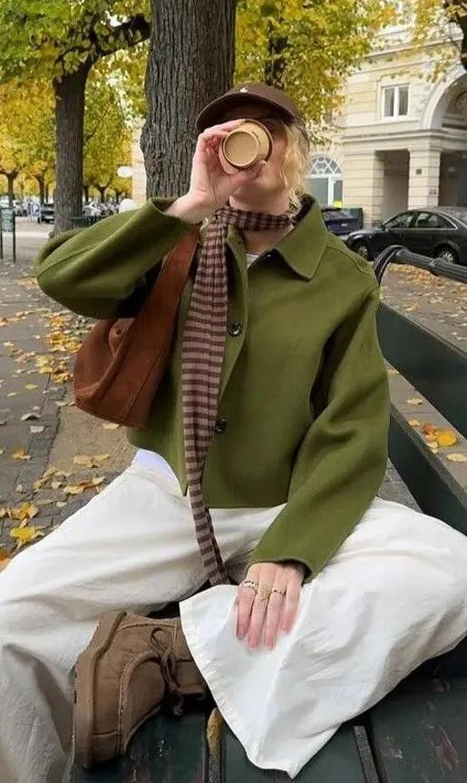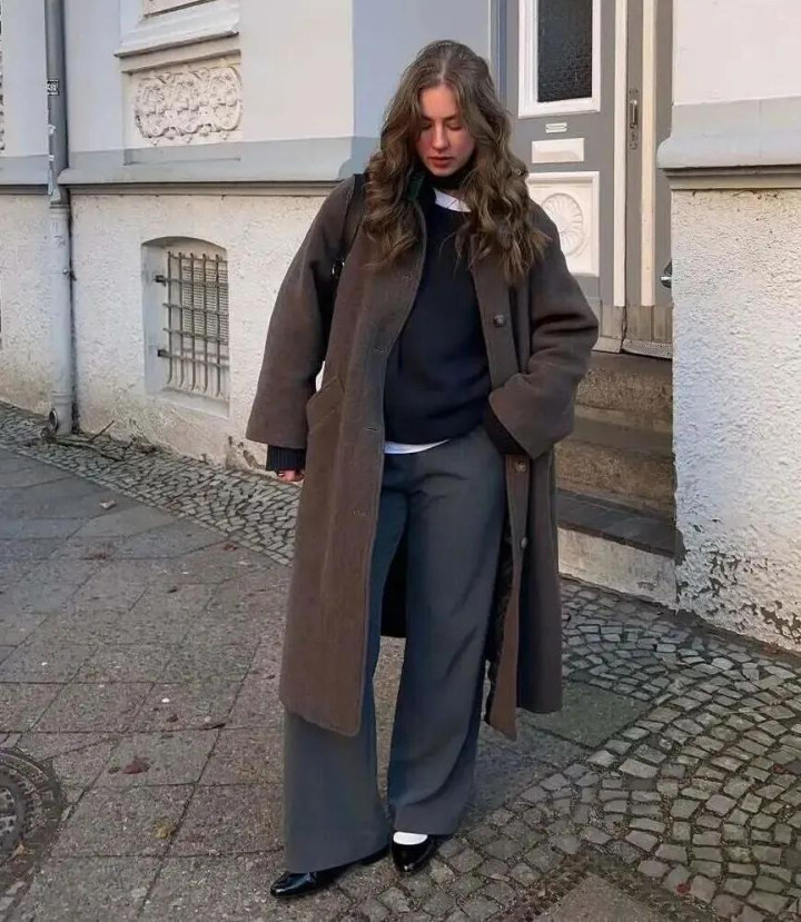 检朴基础的冬季大衣,内搭深色的毛衣,叠穿白色的T恤,自大T恤的领口和下摆,妥贴地提亮搭配又有档次感。灰色阔腿西裤检朴低调,赋予千里稳的气质,整套“轻基础风”穿搭耐看有细节。▼
