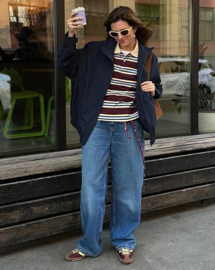 基础款的藏青色夹克外衣搭配基础款高腰阔腿牛仔裤,内搭因循条纹的polo衫,彩色条纹元素为搭配增添轻因循的气味,一整套检朴失业,前卫轻基础风,即兴又大方。▼