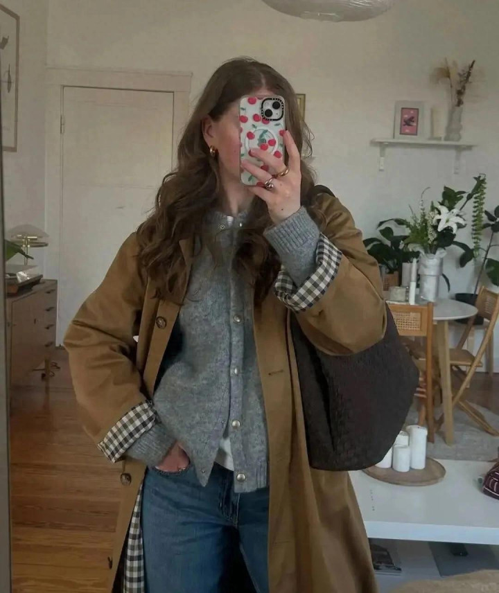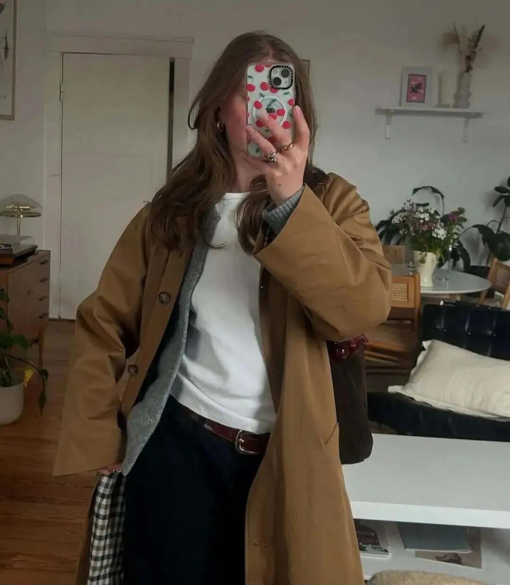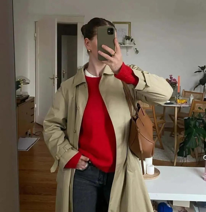 小个子穿基础款的风衣,内搭一件红色的基础款毛衣,红色的加入一刹点亮穿搭,有活力和氛围感,又不失检朴高档感。▼
