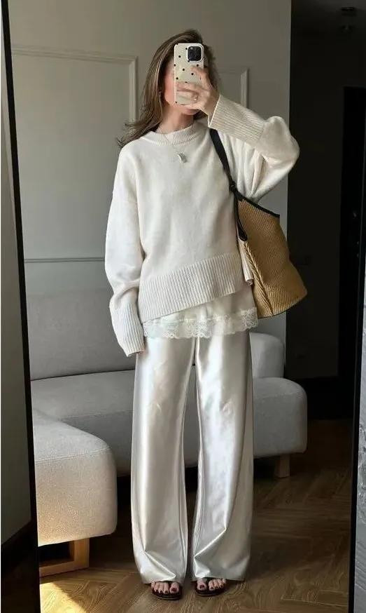 白色基础款毛衣,叠穿白色的缎面内搭,自大紧密的斑纹下摆,下身搭配白色的缎面裤,一整套同色系搭配视觉显高又检朴高档。毛衣的讲理搭配绸缎的不菲、缀以叠穿下摆的精粹,贵气又与众不同的高档感,干净检朴有气质。▼