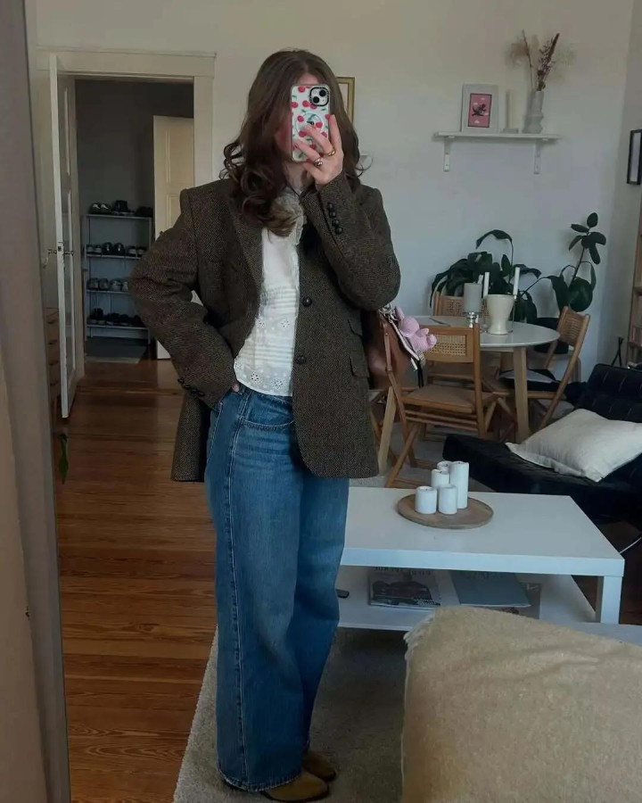 因循肃肃的基础款西装外衣,内搭白色紧密的白色小衫,下身搭配检朴基础的牛仔阔腿裤。内搭的甜好意思、牛仔裤的失业,扫除了西装外衣的严肃,刚柔之间的碰撞,让搭配尽显“轻基础风”的独到作风。▼