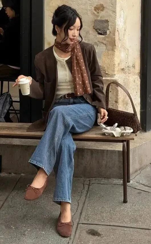 基础款的咖色单西外衣,内搭燕麦色的基础款赤诚开衫,下身搭配基础款的牛仔裤,一整套利落又有讲理气质,检朴因循有氛围感。系一条低迷漫度的波点领巾,提亮搭配,色系作风结合交融又有细节意旨,尽显独到的高档品位。▼