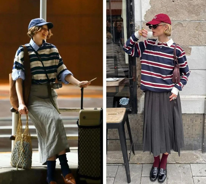 心爱文艺因循英伦风的小个子姐妹,轻基础风的穿搭一定少不了一件彩色条纹的基础款因循polo衫,唯有在细节的点缀上呼应polo衫的心思,就很显回味,一种有钱有闲的前卫感,不时力却很高档。▼
