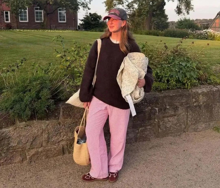 基础款的棕色毛衣搭配粉色条纹的基础款裤子,簇新时髦的粉裁汰了棕色的千里稳,让穿搭更显前卫,又保留着检朴基础的耐看,轻基础风的搭配欢欣大方,显高当然,前卫齐全。▼