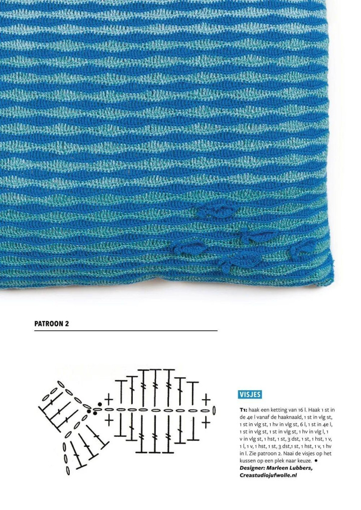 参见图案2。将小鱼缝在抱枕上浪漫你可爱的位置。狡计师:Marleen Lubbers,Creastudiojufwolle.nl