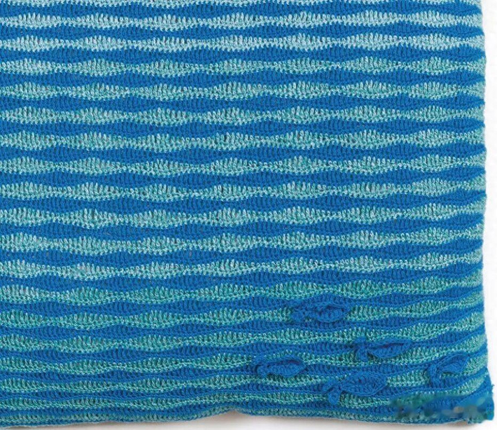 风景轮回:按图解 “v, hst, dst, st, hst, v”(短针、中长针、长针轮流)钩织,每 2 行完成 1 组海浪转念;