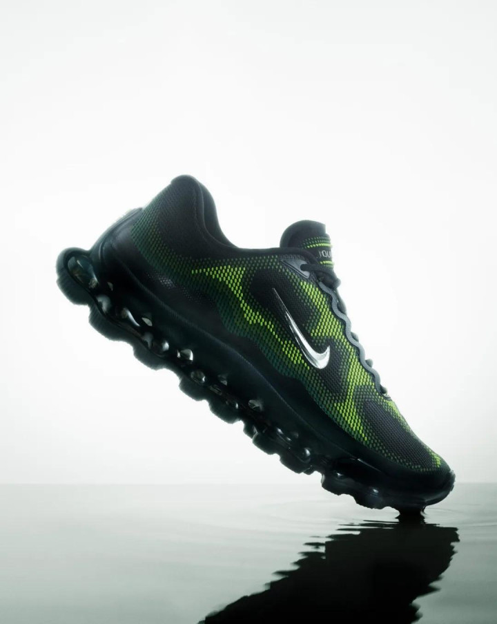 整双鞋采取极具过去感的时尚想象,绿黑撞色搭配视觉冲击力极强,中底配备分段式可视 Air 气垫,造型科幻感拉满,侧身玄色 Swoosh 则进一步擢升合座辨识度。