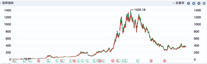 先看隆基的历史K线走势,不错看到2018年到2021年有过一波翻天覆地的超等大牛市行情,3年期间里最多高潮了10几倍,如果从2017年的低位算起,更是最高20倍的超等大牛,然后从2021年底后,用几年的期间最多跌去了80%,险些是从何处来往何处去。