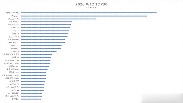 凭据行业东谈主士“RD不雅测”提供的数据,W12周单品销量前三被苹果紧紧抢占,国产排行第一的是华为nova 15,不得不惊叹网友的神指摘。那时国产机型加价时网友讲这是要给苹果神助攻,成果在W12周不管是品牌销量第一,如故单品销量前三透彻被苹果拿走。在华为nova 15之后上榜的国产机型有vivo Y50 2025、REDMI 15R、vivo S50、荣耀X70、华为Mate 80、荣耀畅玩60A、OPPO Reno15、OPPO A5x、vivo Y500i、REDMI K90等等,剩下的机型人人我方看就可以,要点是给人人转头一下本周单品销量Top30的举座特色。