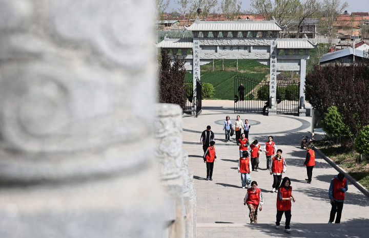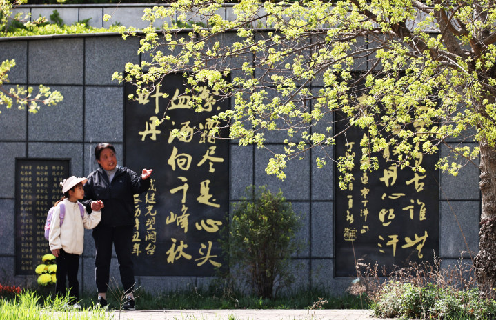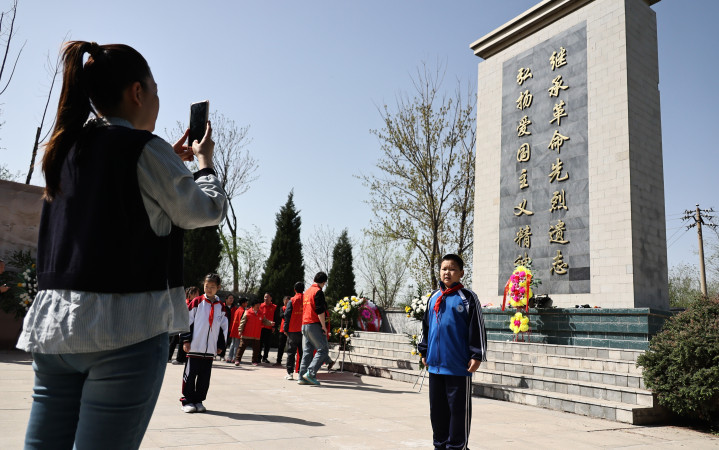 改进老区山西省运城市新绛县家长和孩子在三泉改进义士陵寝拍照惦念先烈