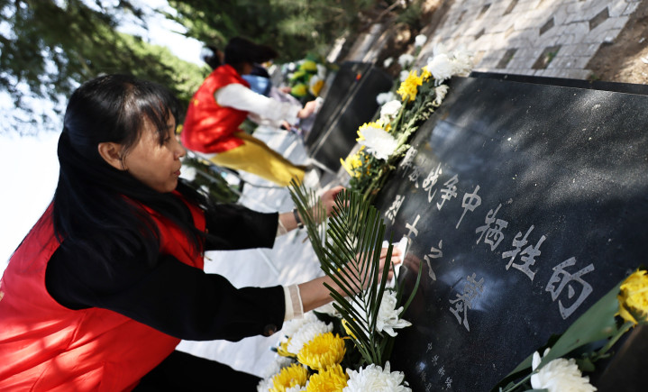 在改进老区山西省运城市新绛县三泉改进义士陵寝,爱心公益定约志愿者擦抹先烈墓碑并献花
