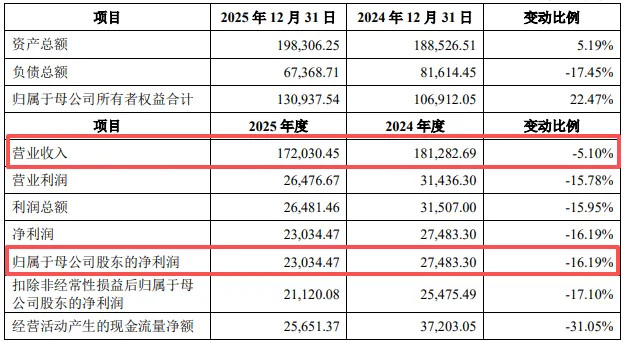 财务数据显现,2025年,公司竣事买卖收入17.20亿元,同比下滑5.10%;归母净利润2.30亿元,降幅高达16.19%,利润下滑幅度远超营收下滑幅度。更令东谈主担忧的是,公司展望2026年一季度买卖收入同比下跌8.87%。