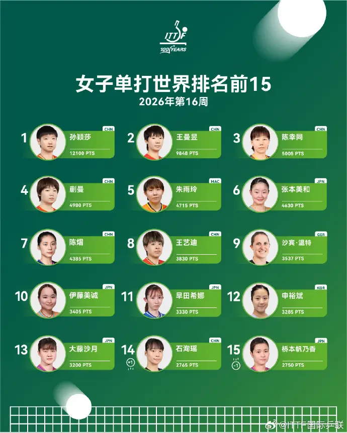 北京技艺4月14日音书,跟着2026WTT通例挑战赛太原站圆满终止,外洋乒联2026年第15周天下排行也火热出炉,女子单打方面,中国女乒在前10中有6名球员,何况包揽前四。其中,孙颖莎、王曼昱持续稳居第一、第二。